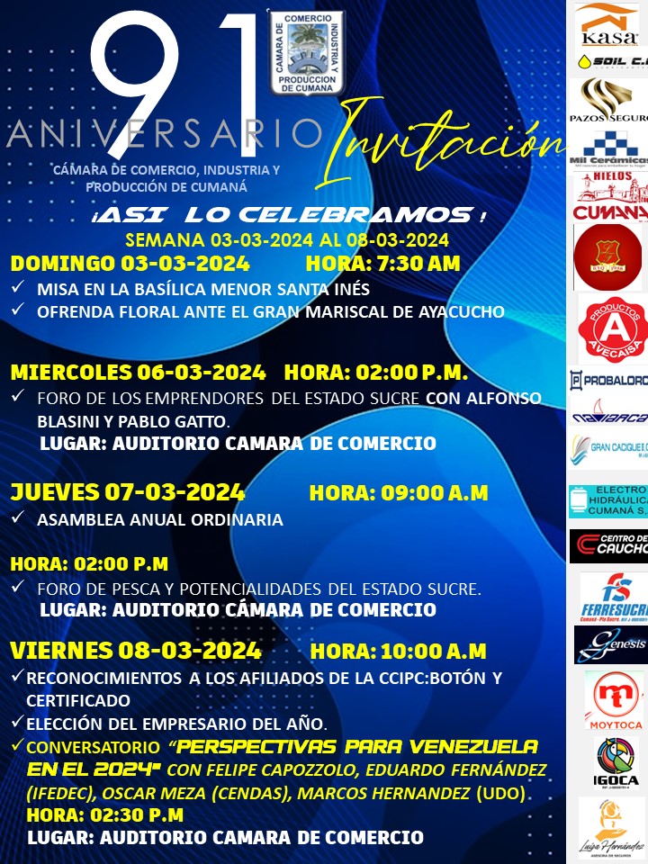 La Cámara de Comercio, Industria y Producción de Cumaná celebra con júbilo su 91º aniversario, un recorrido histórico marcado por el fomento del desarrollo económico y social en la región oriental del país.