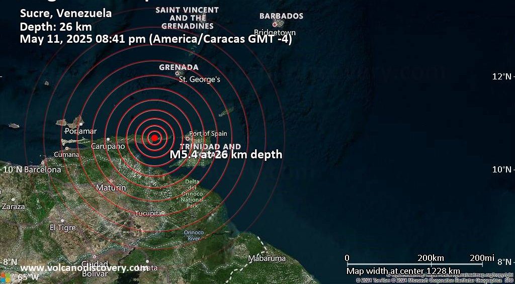 La Fundación Venezolana para Investigaciones Sismológicas (Funvisis) informó sobre un movimiento telúrico de magnitud 4.9 mw, registrado a las 8:41 p. m. de este domingo, 11 de mayo. El epicentro del sismo se ubicó entre las localidades de Macuro y Güiria, en el estado Sucre. El evento sísmico, que también fue reportado por usuarios en