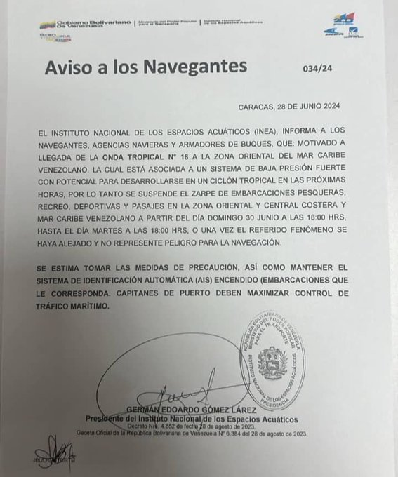 El Instituto Nacional de los Espacios Acuáticos (INEA) ha anunciado la suspensión del zarpe de todas las embarcaciones en las zonas oriental y central costera del país, así como en el mar Caribe venezolano. Esta medida preventiva, que estará en vigor desde las 6:00 pm de hoy hasta las 6:00 pm del 2 de julio, busca garantizar la seguridad marítima ante la inminente llegada de la onda tropical número 16, convertida en el huracán Beryl de categoría 4.